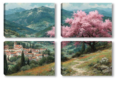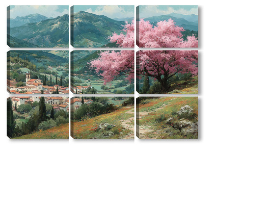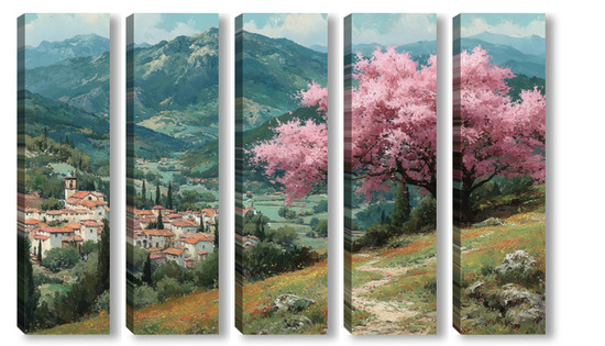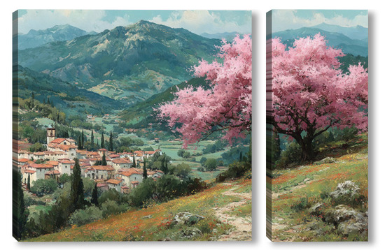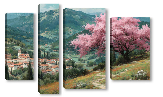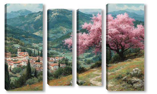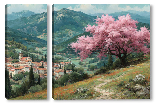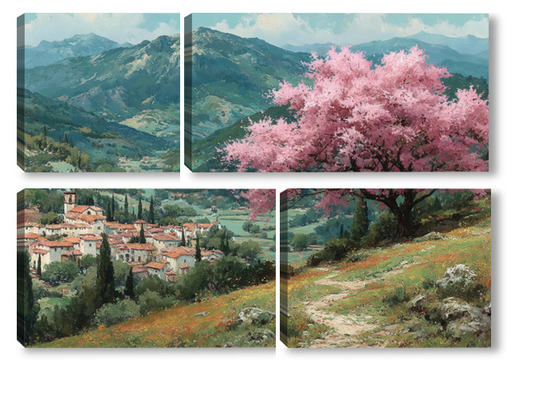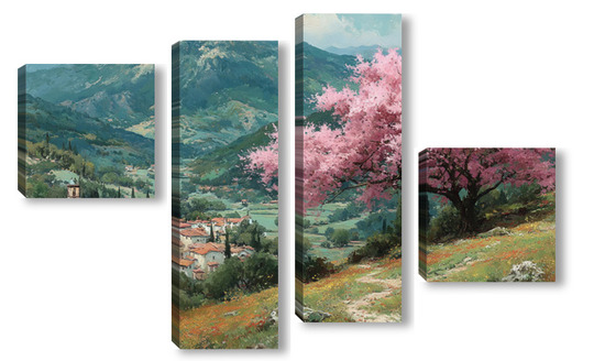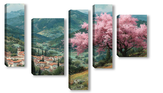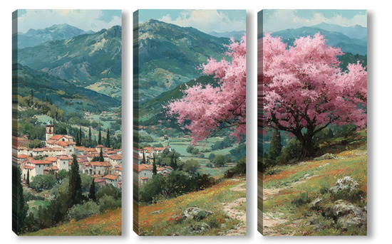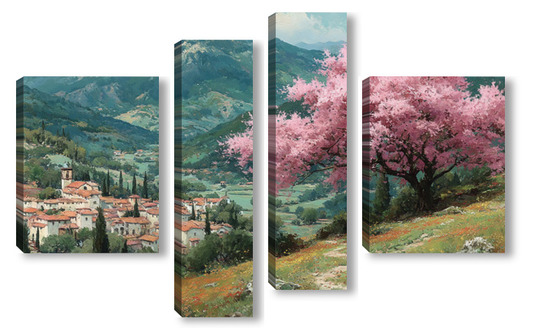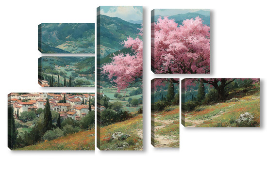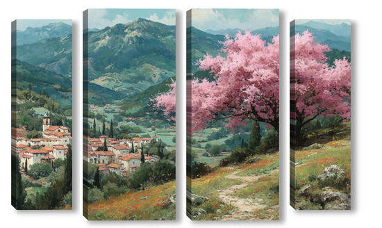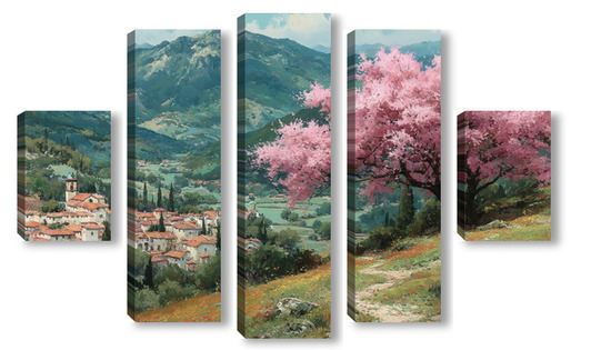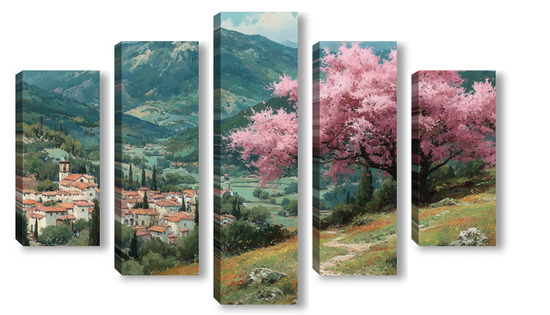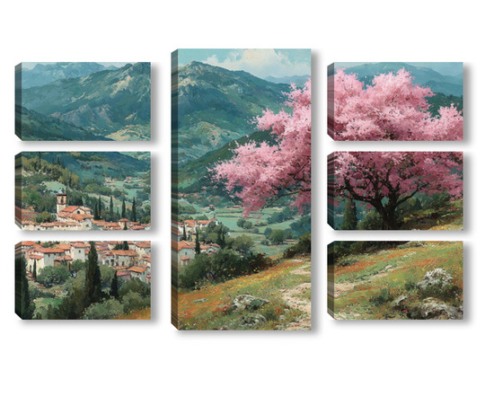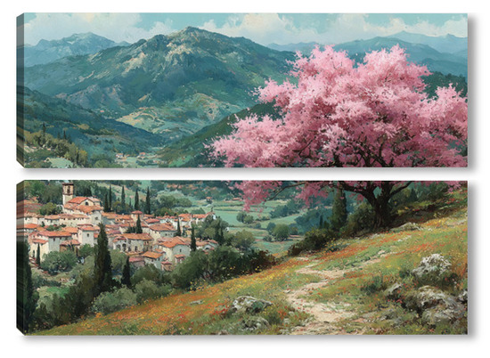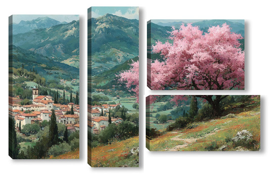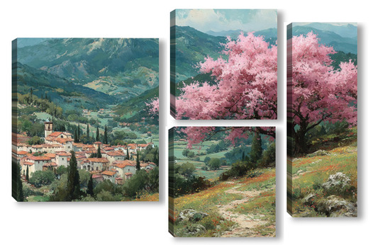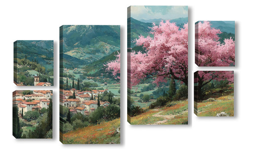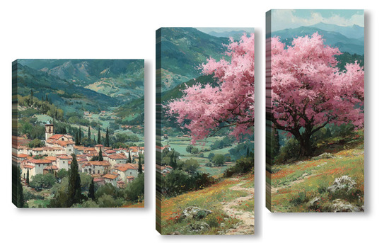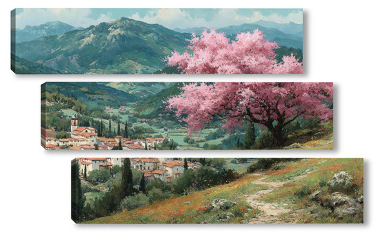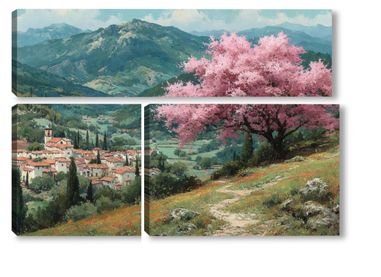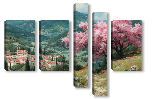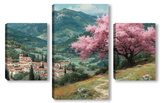 Модульная картина Цветущий миндаль над горной деревней Цветущий миндаль над горной деревней