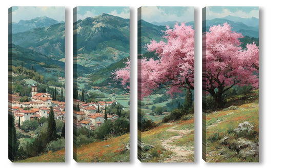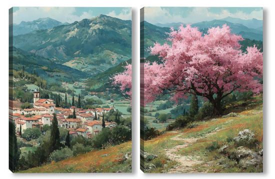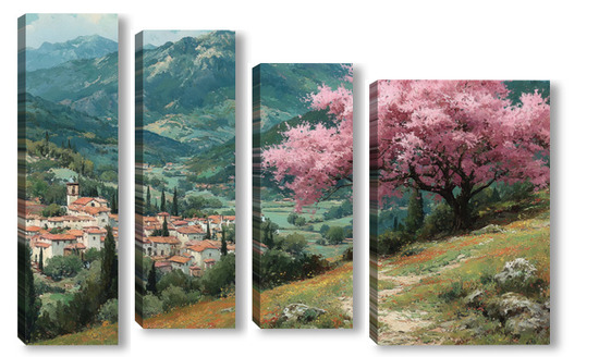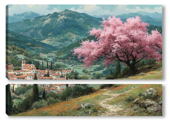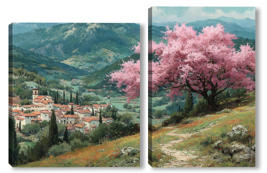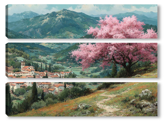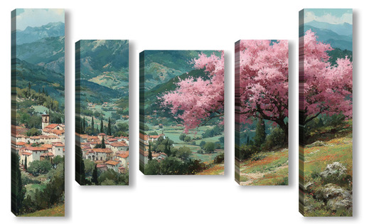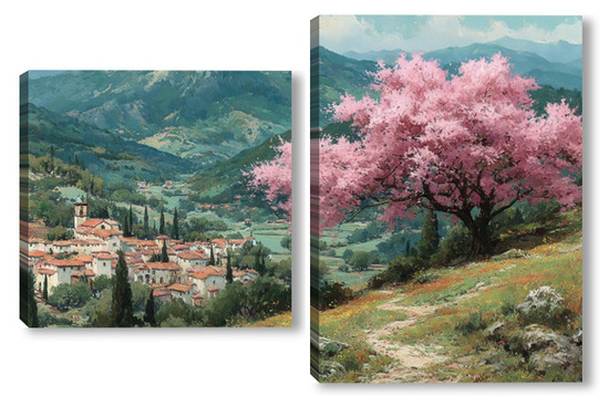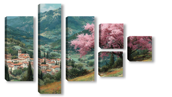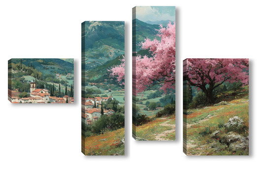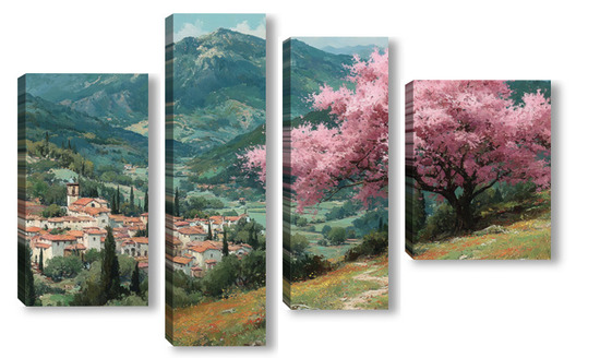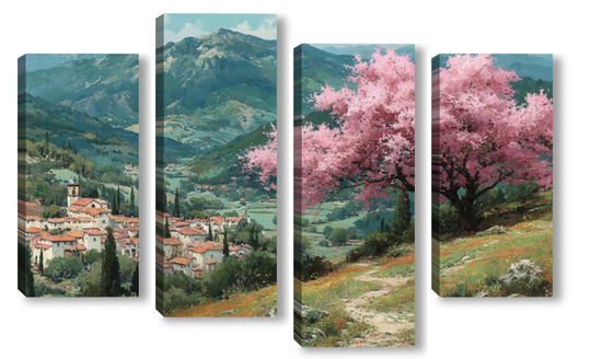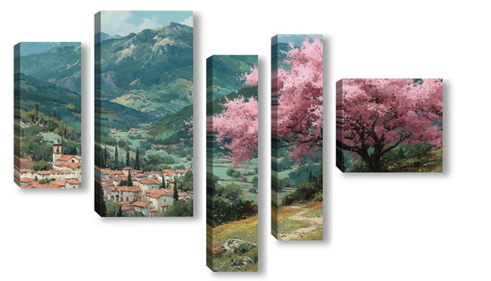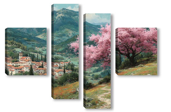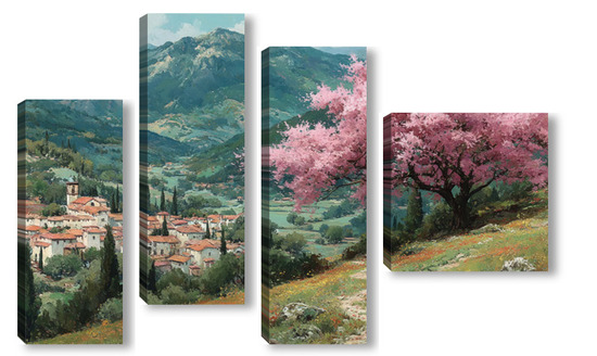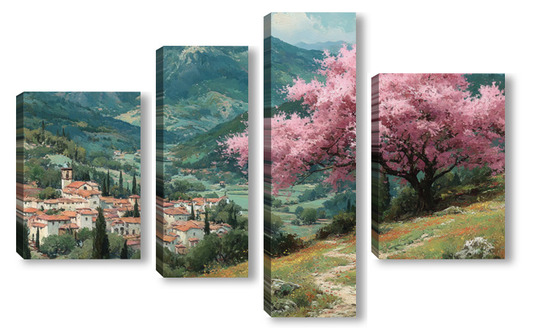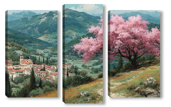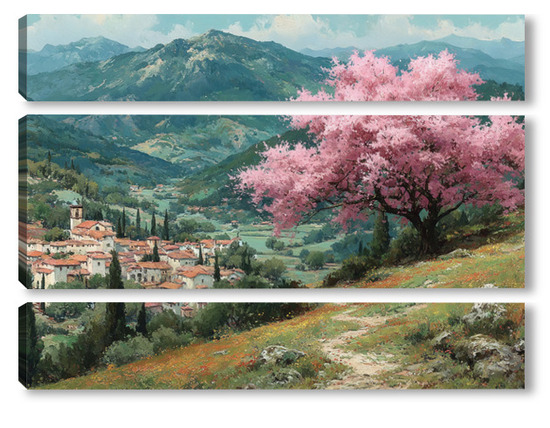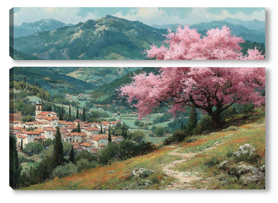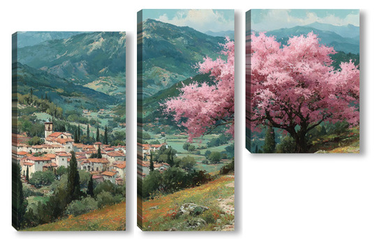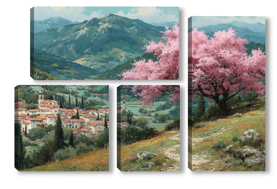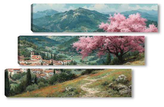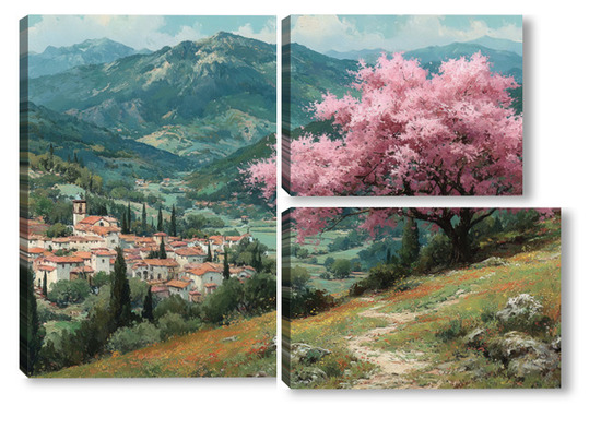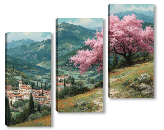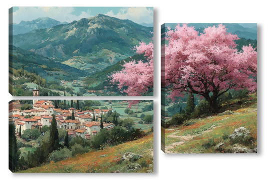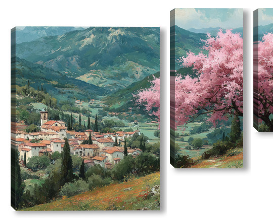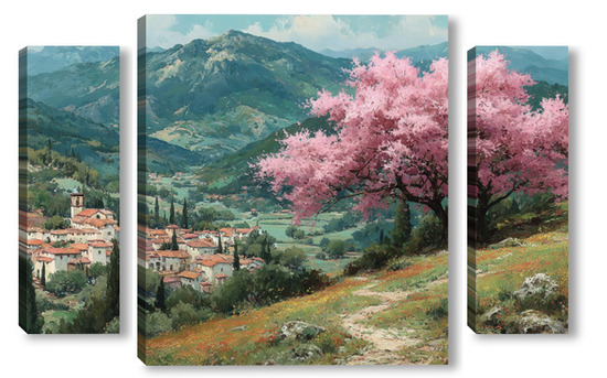Модульная картина Цветущий миндаль над горной деревней Цветущий миндаль над горной деревней