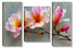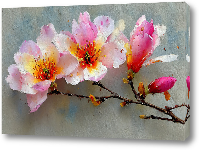На картине изображена ветка с тремя крупными цветами нежных розовых и жёлтых оттенков. Картина передаёт ощущение свежести и весеннего пробуждения. Подойдет для кухни, спальни или гостиной.