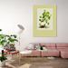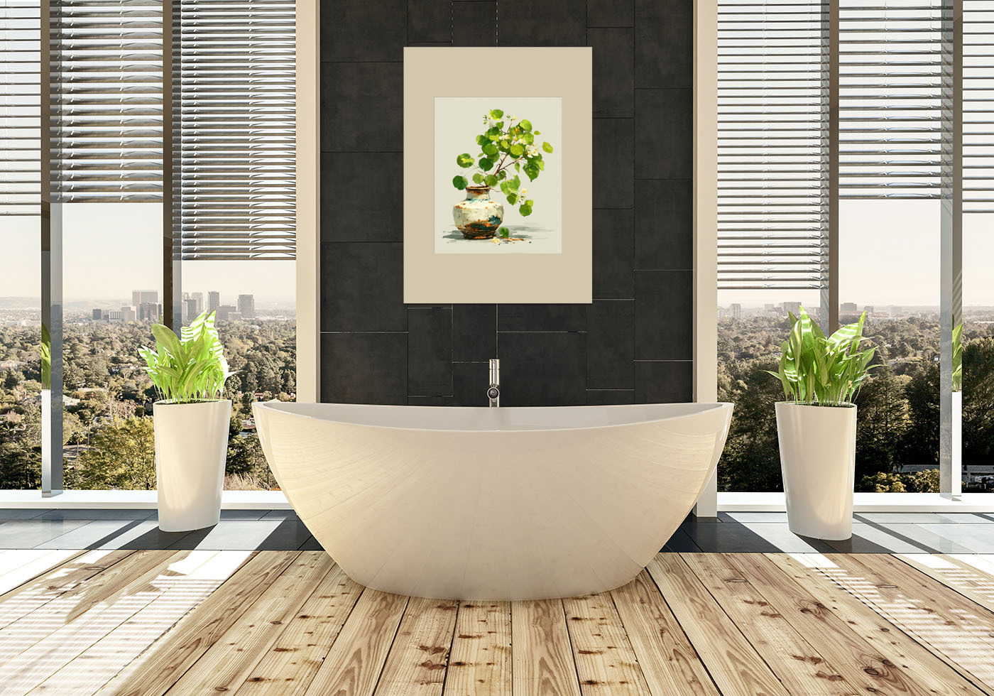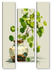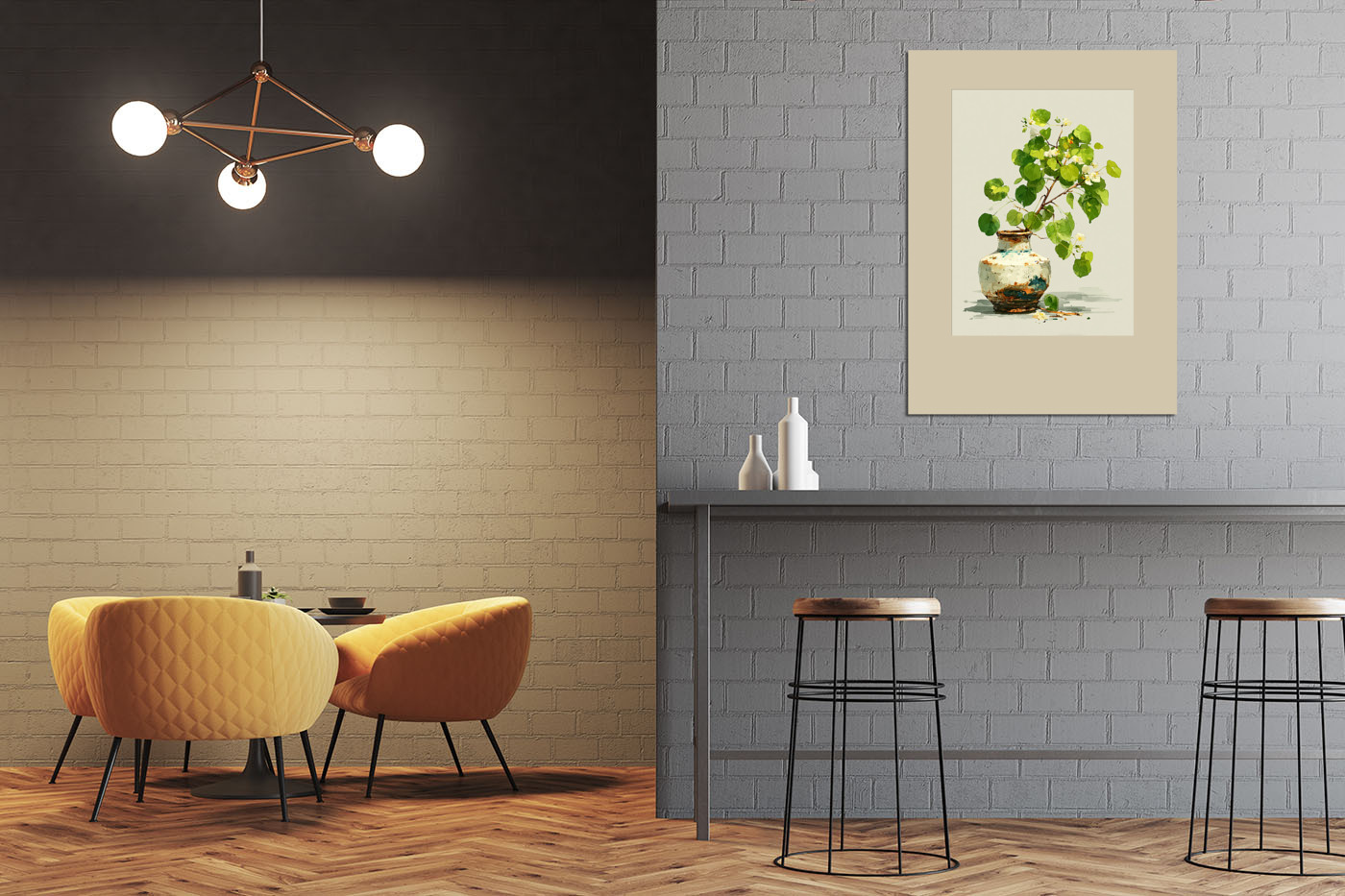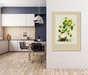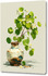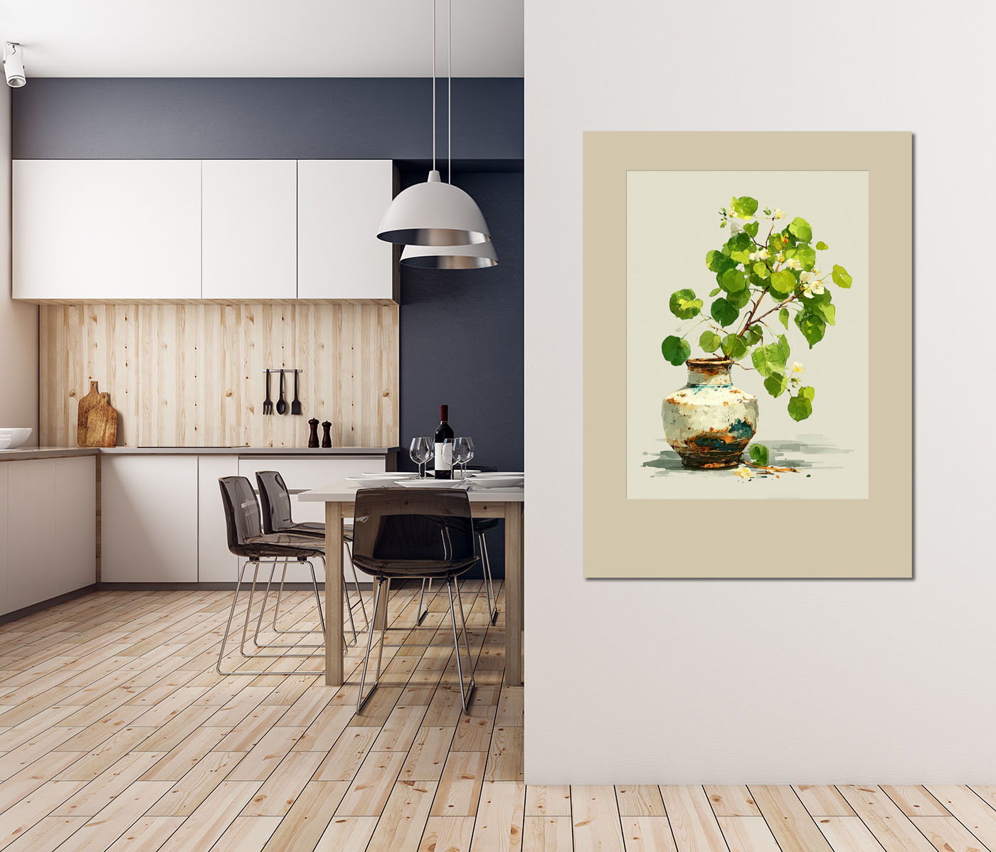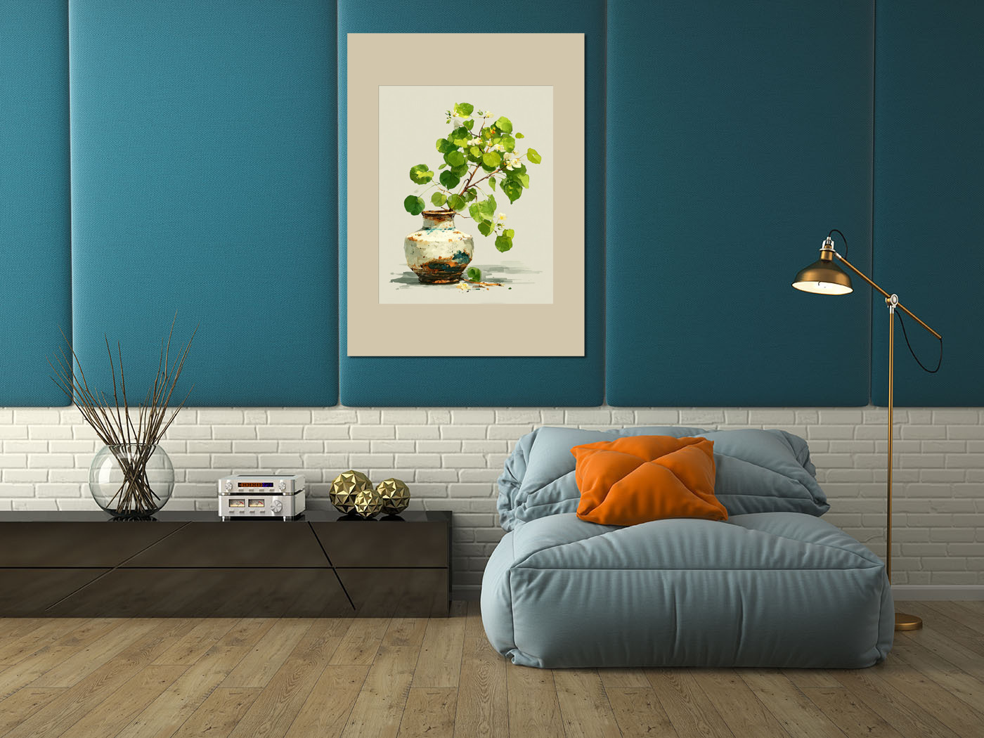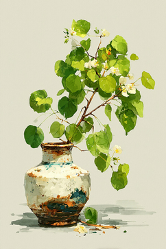 На картине изображён натюрморт: в старинной, потёртой вазе с бело-голубыми оттенками стоит ветка с ярко-зелёными листьями и нежными белыми цветами. Композиция выполнена в акварельной технике, фон нейтральный, что подчёркивает свежесть зелени и фактур