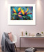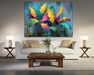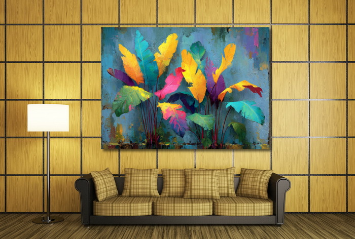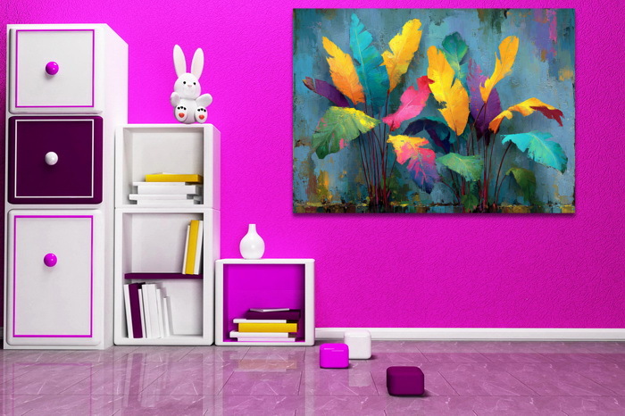 Яркая абстрактная картина с изображением экзотических листьев в насыщенных оттенках: жёлтом, розовом, бирюзовом, фиолетовом и зелёном. Фон в холодных серо-голубых тонах подчёркивает выразительность композиции. Жирные мазки и динамичные формы создают