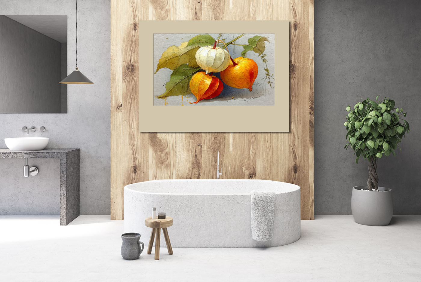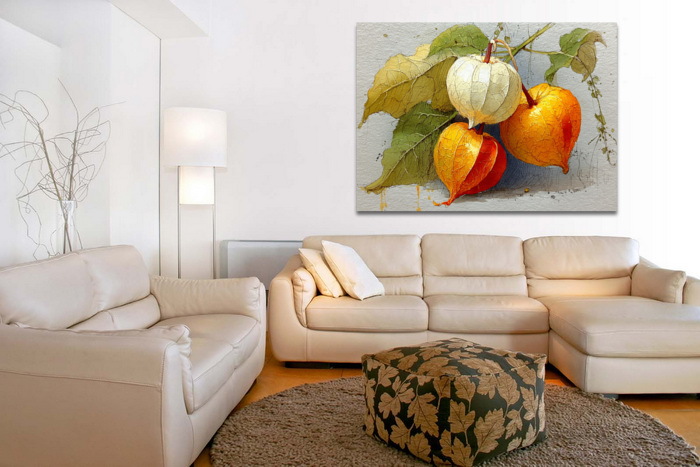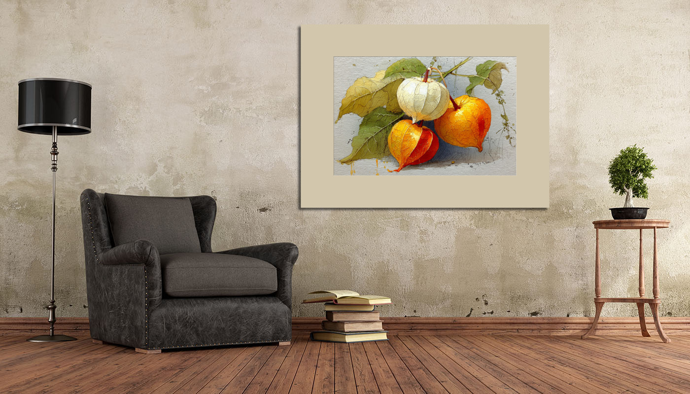 Натюрморт для кухни или гостиной, передаёт природную красоту и хрупкость плодов физалиса.