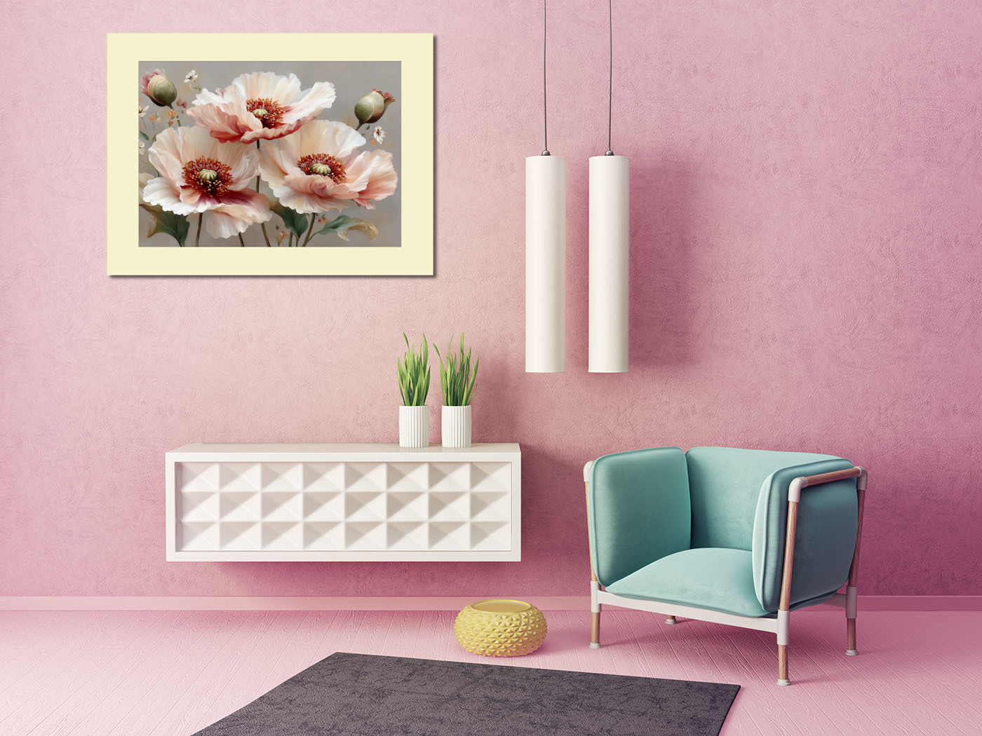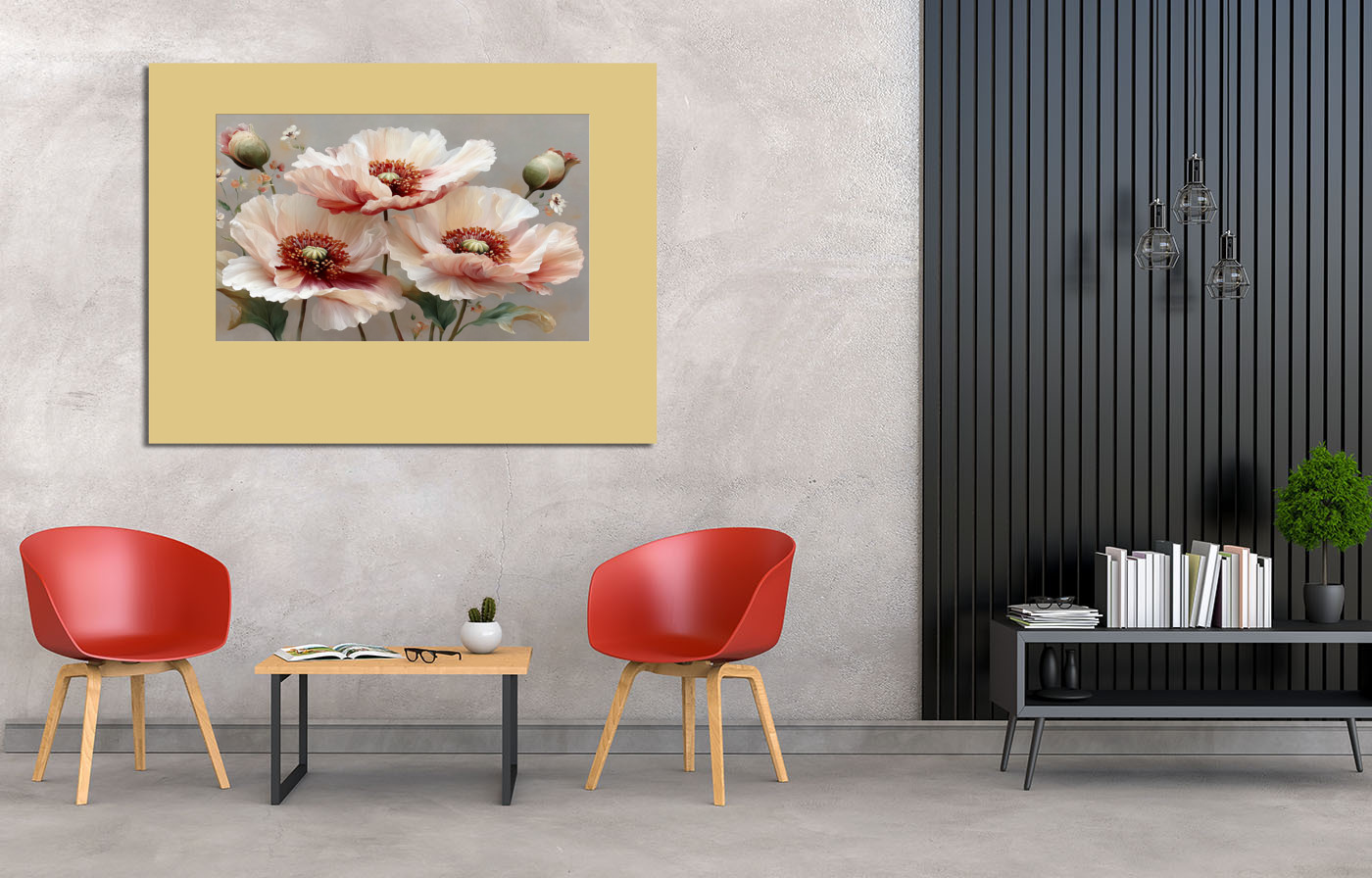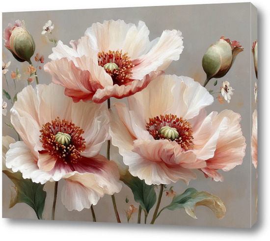 Эта картина с изображением крупных маков в мягкой цветовой гамме и пастельных тонах отлично впишется в интерьер гостиной, столовой, кухни или спальни.