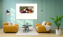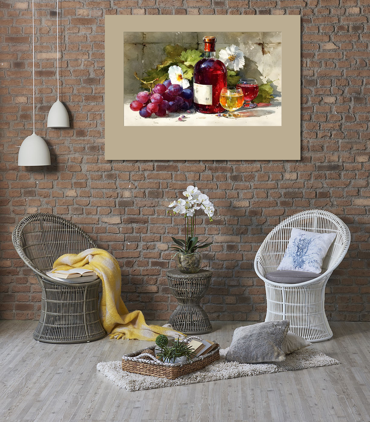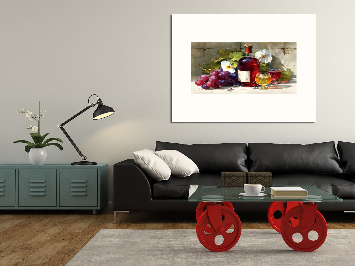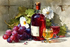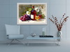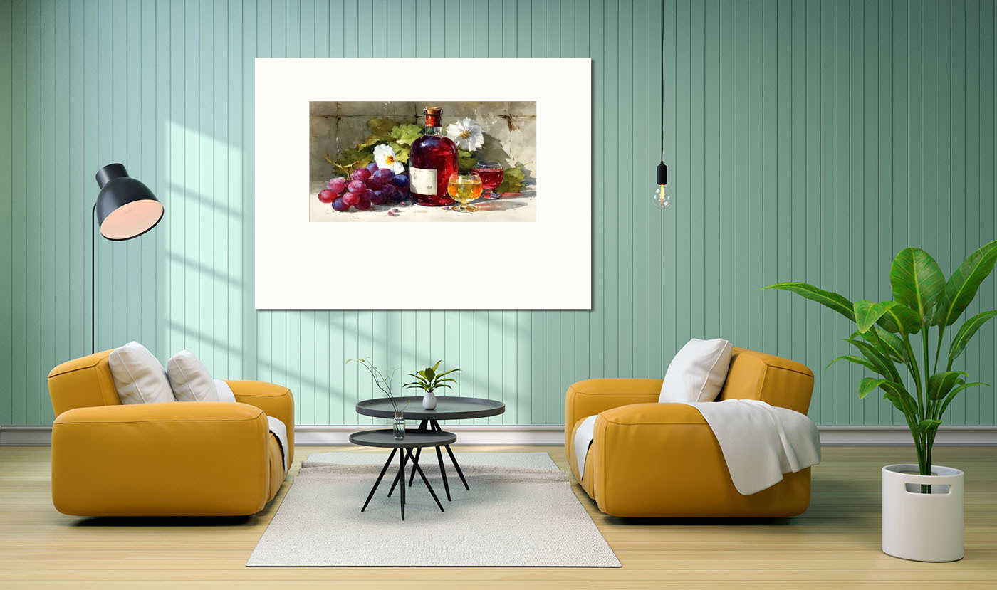 Уютный натюрморт: вино, виноград, цветочная свежесть и игра света на стекле. Картина создаёт особое настроение в интерьере.