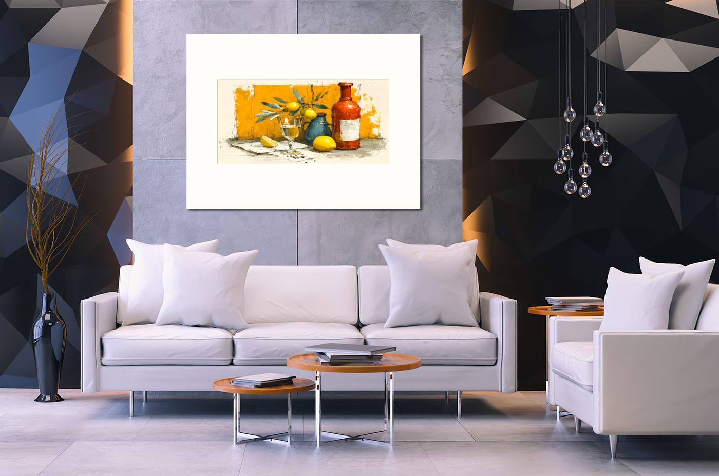 Тёплый натюрморт с элементами средиземноморского стиля: лимоны, бокал, бутылка, ваза. Художественная работа для уютного дома и особого настроения.