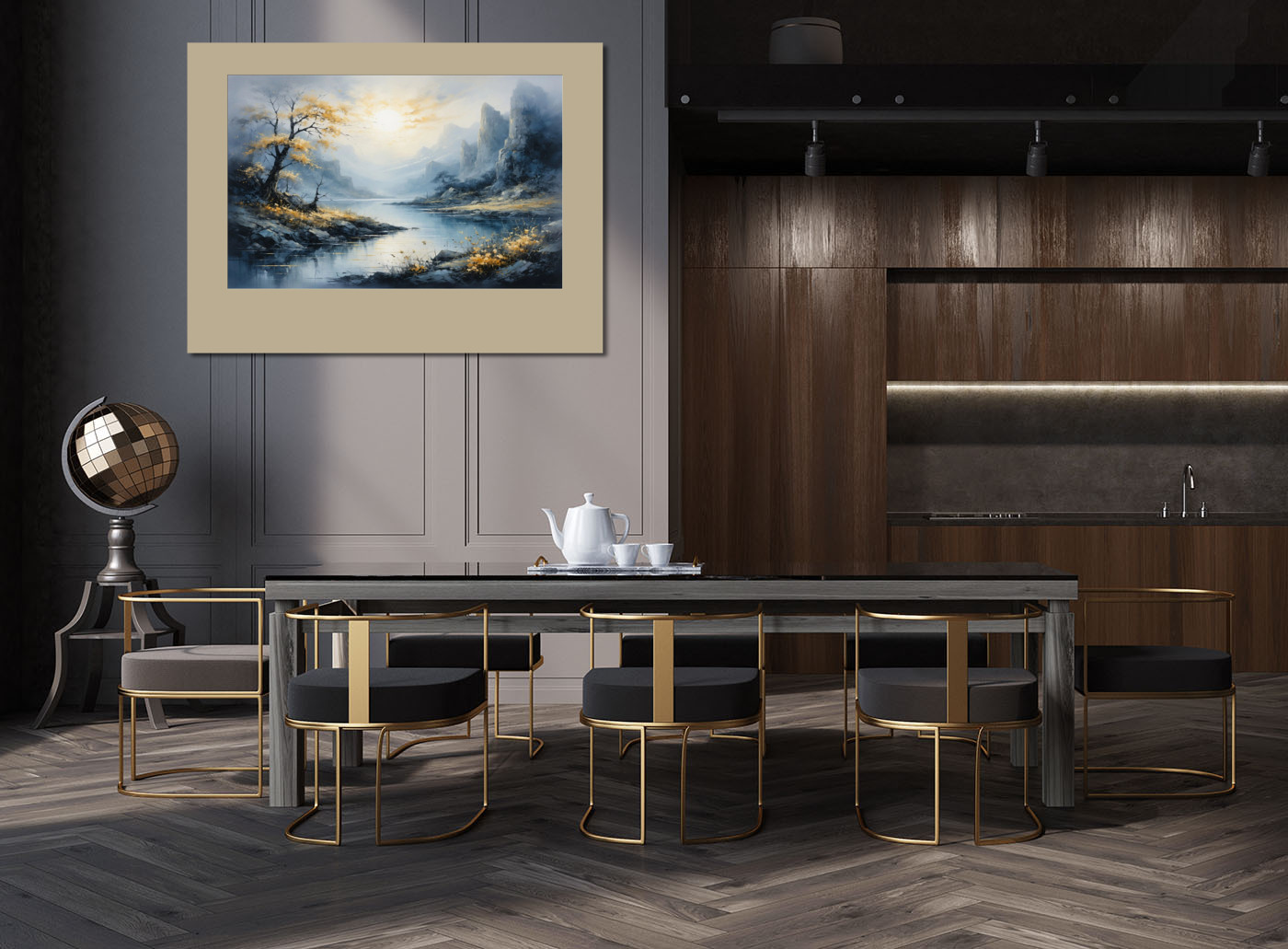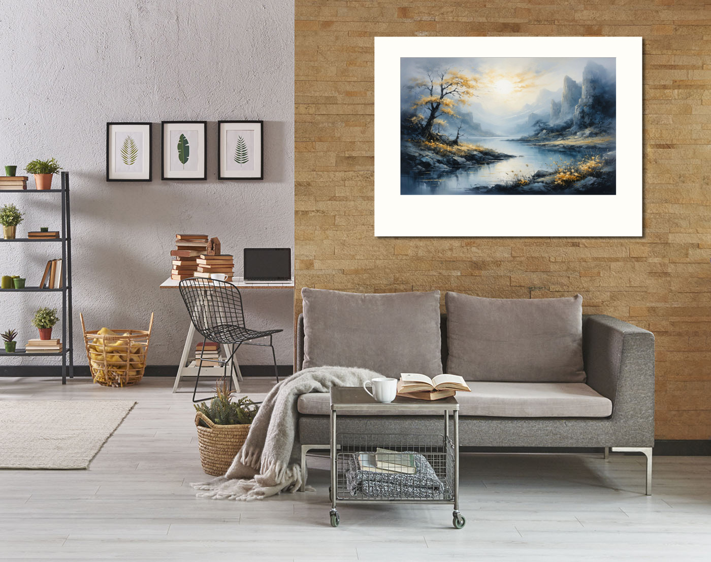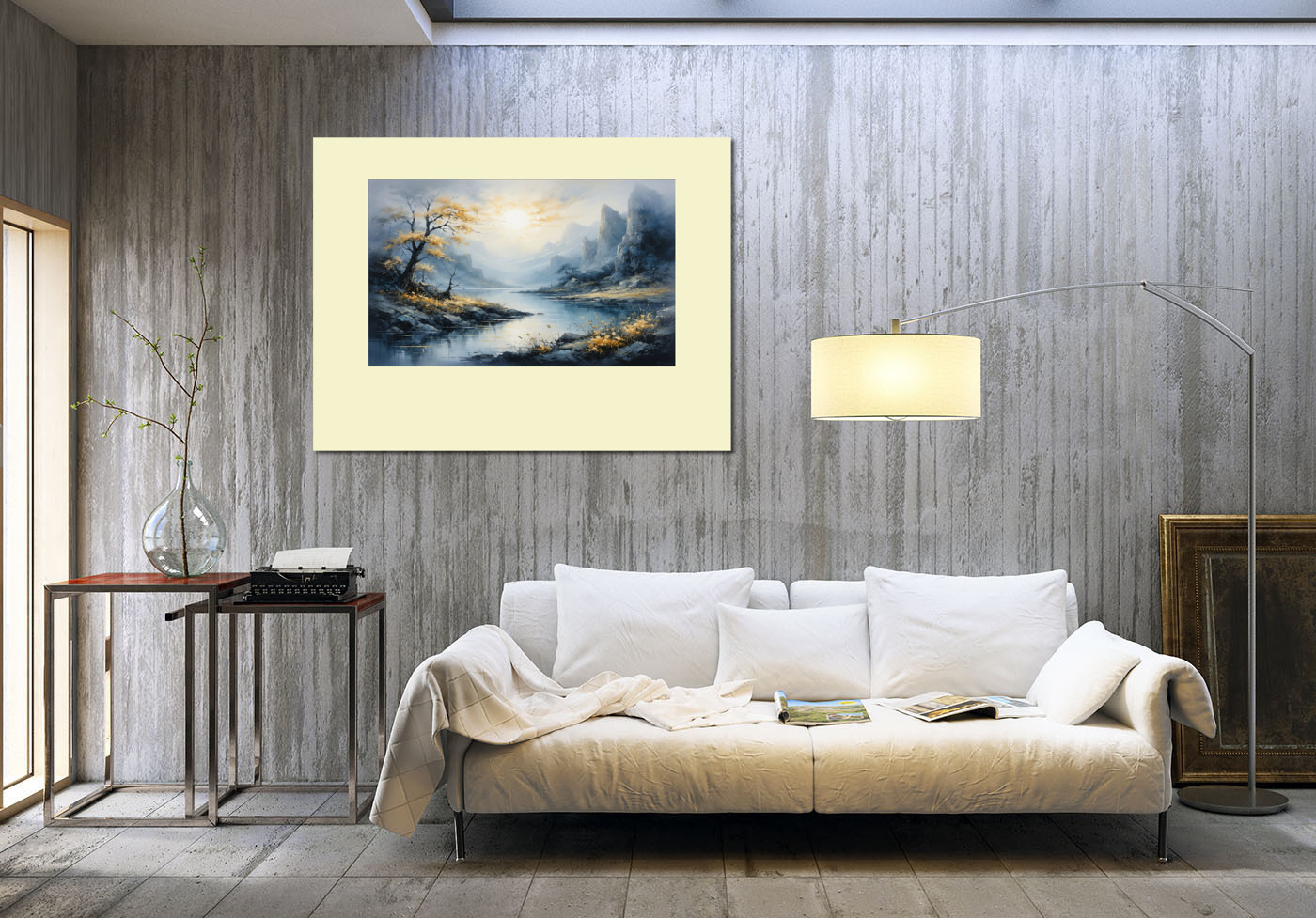 Картина "Умиротворение. Туманные скалы и золотое дерево у воды"